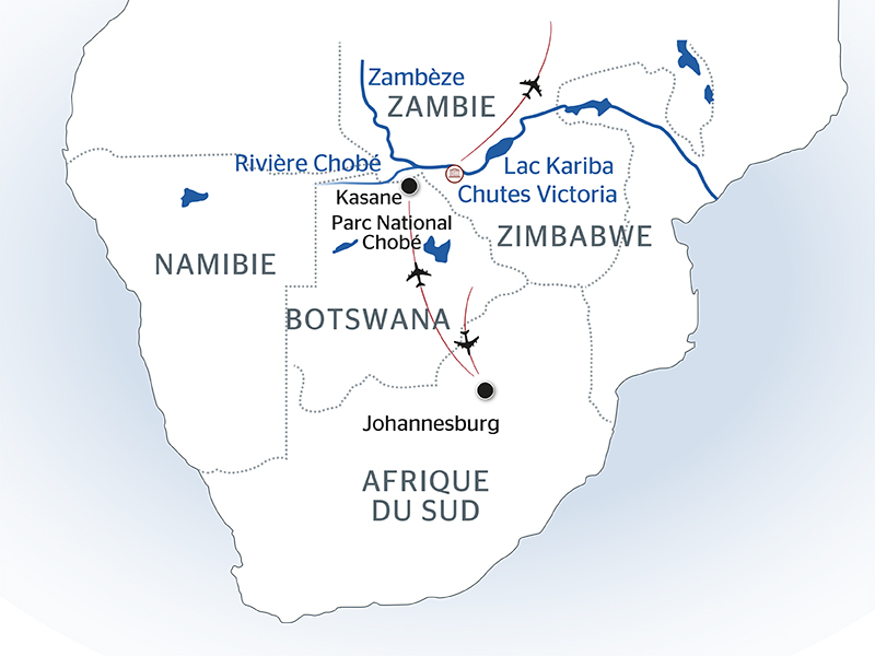 les vols internationaux mentionnés au programme - le vol régulier Johannesburg/Kasane - les vols privés Kasane/Lac Kariba/Victoria Falls - les taxes aéroport (675€ - Tarif 2025) - les transferts - la croisière en cabine double selon la catégorie choisie - l'hébergement en chambre double en lodge CroisiEurope de première catégorie et en hôtels 4 et 5*NL - la pension complète pendant tout le safari-croisière - les boissons incluses à tous les repas et au bar sur le bateau et au lodge CroisiEurope - à Johannesburg et Victoria Falls, boissons incluses : 1 eau + 1 verre de vin local* ou 1 soda ou 1 bière locale* + 1 thé ou 1 café par personne et par repas - les visites et excursions mentionnées au programme (hors excursions optionnelles) - l'assurance assistance / rapatriement - les pourboires (hors personnel du bateau et du lodge).